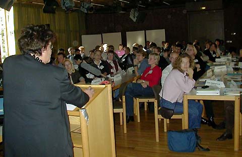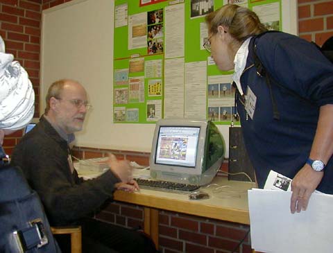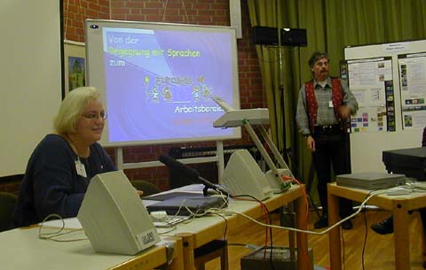 Am zweiten Tag der Europrim standen drei Vorträge und drei detaillierte Projektpräsentationen im Plenum auf dem Programm. Susanna Flach Nielsen aus Dänemark stellte das Projekt "Geschichten ohne Worte" vor. Mit Hilfe eines Computerprogramms können Kinder eine Geschichte nur mit Bilder und Tönen erstellen. Das Resultat: eine Geistergeschichte: "A Scary Story". Anschließend stellten Annegret Dons und Johannes Kimmel-Groß den neuen "learn:line"-Arbeitsbereich "Kinder in Europa" vor. Eine Arbeitsumgebung auf dem NRW-Bildungsserver, der es Lehrenden und Lernenden aus verschiedenen Ländern erlaubt, miteinander in Kontakt zu treten und sich kennen zu lernen. Vorurteile lassen sich so abbauen. Als drittes Projekt wurde "Challenge 2000" aus Großbritannien präsentiert. Dabei handelt es sich um eine virtuelle Reise um die Welt in einem Heißluftballon. Kinder, die daran teilnehmen, steuern insgesamt 10 bedeutende Orte auf der ganzen Welt an. Welche Städte das sind, müssen sie selbst herausfinden. Dazu müssen Aufgaben aus den verschiedensten Wissensbereichen gelöst werden. Eric Tibble und John Davies stellten dieses britische Pilotprojekt vor.