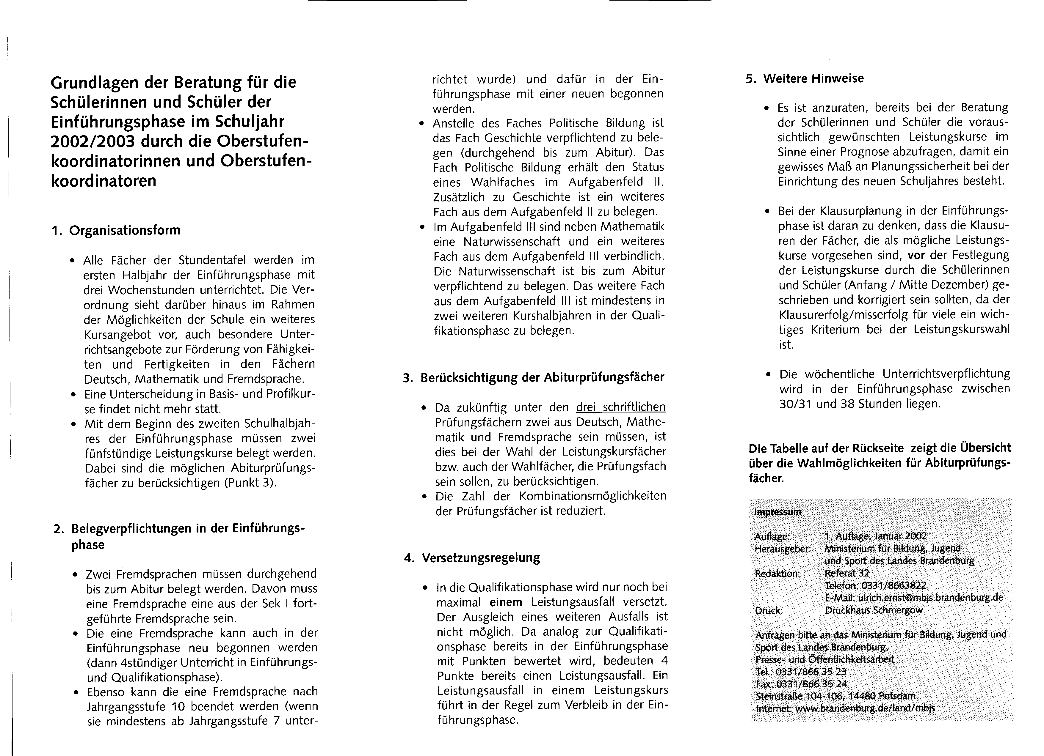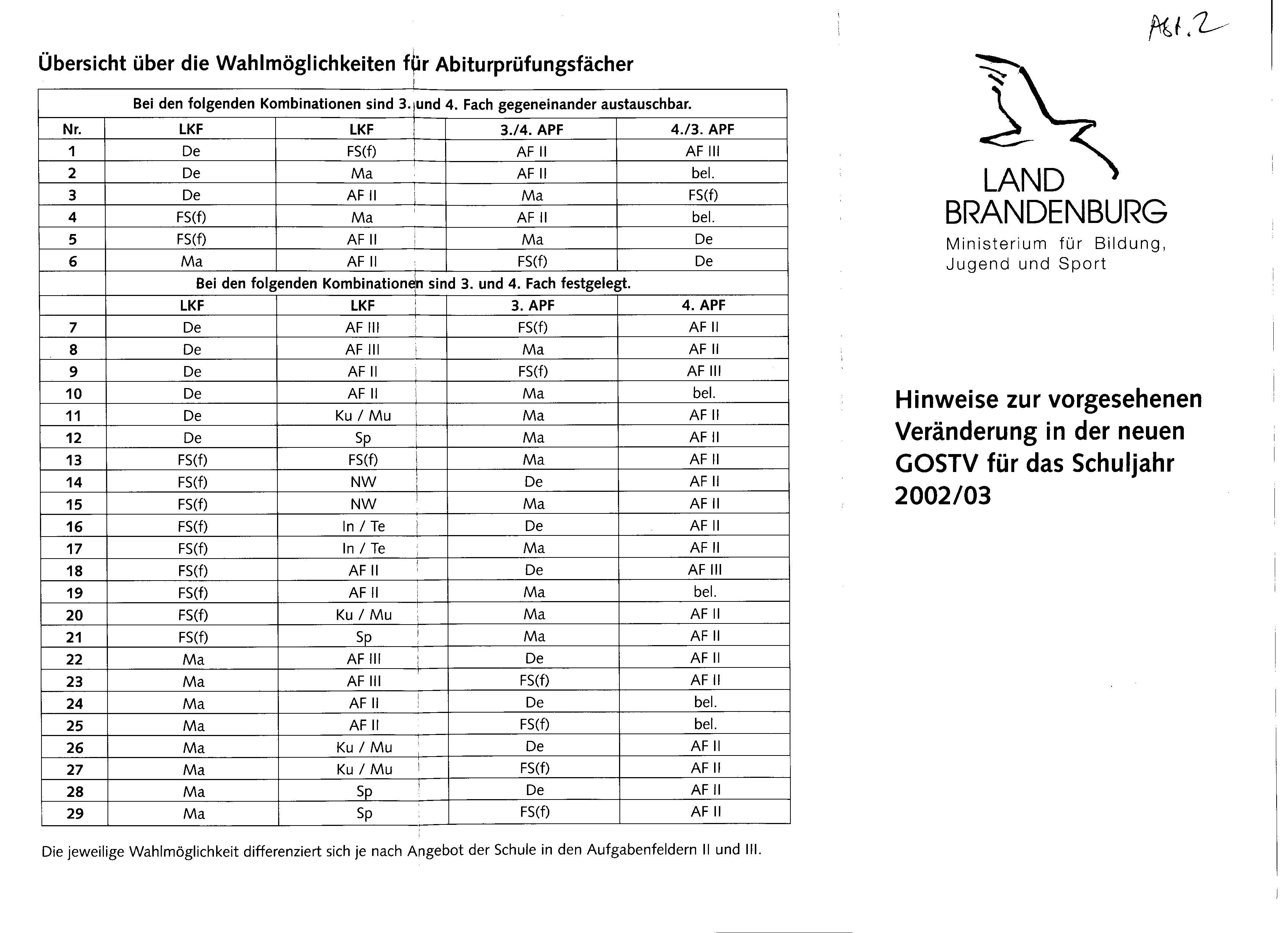 Hinweise zur vorgesehenen Veränderung in der neuen GOSTV für das Schuljahr 02/03 _Wahlmöglichkeiten - MBJS Brandenburg - 2002