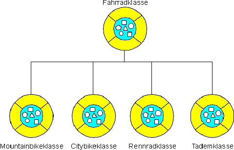 Eine ähnliche Entwicklungsmöglichkeit bietet OOP an. Wir können neue Klassen mit Hilfe anderer Klassen programmieren. Unser Fahrradbeispiel können wir wie folgt modellieren: Die Klasse Fahrrad ist unser Urfahrrad mit Eigenschaften und Verhalten die allen Fahrrädern gemeinsam sind. Danach erweitern wir die Klasse, fügen neue Eigenschaften hinzu und ändern bestehende ab. Somit erhalten wir unsere Mountainbike-, Citybike-, Rennräder- und Tandemklasse. Diese Klassen werden in OOP Unterklassen (engl. subclasses) von der Klasse Fahrrad genannt. Die ursprüngliche Fahrradklasse wird Oberklasse (engl. superclass) genannt.
