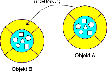 Vorteile der Meldungen: Alles was ein Objekt machen kann, wird mit Meldungen ausgedrückt. Das Verschicken von Meldungen ist die einzige Möglichkeit, wie sich Objekte verständigen können. Objekte müssen sich nicht unbedingt auf derselben Maschine befinden. Meldungen können auch über das lokale Netzwerk oder Internet verschickt werden. Der Aufruf einer Methode entspricht dem Schicken einer Meldung. Deshalb sprechen wir meist von Methodenaufruf anstelle von Meldung verschicken. |