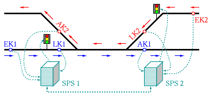 Dieses soll am Beispiel eines Forschungsprojektes dargestellt werden, das die Abteilung in den vergangenen drei Jahren in Zusammenarbeit mit der Universität Bremen und der Berliner Firma Elpro AG durchgeführt hat. Das Projekt war durch ein Anwendungsgebiet der Elpro bestimmt: die Konstruktion von Steuerungen für Straßenbahnen. Als konkrete Fallstudie wurde die Sicherung eingleisiger Strecken (kurz SES) betrachtet (Abbildung 1).
