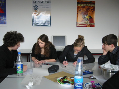Anwendungsbereites Wissen wurde auch in der anschließenden Gruppenarbeit verlangt. In kleinen Gruppen entwickelten die TeilnehmerInnen Strategien, um die gestellten Aufgaben zu lösen. Die Jurymitglieder beobachteten sie dabei und stellten fest, wer besonders mit Ideen und Leistung die eigene Gruppe voranbrachte. Die gestellten Aufgaben wurden von den TeilnehmerInnen interessiert aufgenommen und mit viel Elan wurden Lösungsstrategien entwickelt.