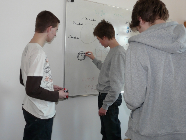 Anwendungsbereites Wissen wurde auch in der anschließenden Gruppenarbeit verlangt. In diesem Jahr galt es, ein Auto mit einer gewissen Durchschnittsgeschwindigkeit zum Schrottplatz zu fahren, einen Kaffeeflecken geschickt zu überdecken. eine Einteilung in Projektgruppen zu untersuchen, und schließlich zu zeigen, wie man durch Abwiegen eine Falschmünze entdecken kann. In kleinen Gruppen entwickelten die TeilnehmerInnen Strategien, um die gestellten Aufgaben zu lösen. Die Jurymitglieder beobachteten sie dabei und stellten fest, wer besonders mit Ideen und Leistung die eigene Gruppe voranbrachte. Die gestellten Aufgaben wurden von den TeilnehmerInnen interessiert aufgenommen und mit viel Elan wurden Lösungsstrategien entwickelt.