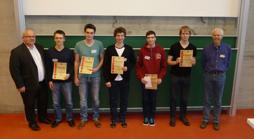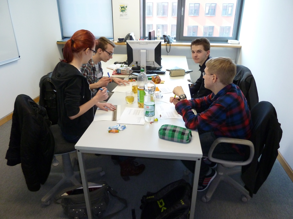 Anwendungsbereites Wissen wurde auch in der anschließenden Gruppenarbeit verlangt. In diesem Jahr galt es, verschiedene Gewinnstrategien von Spielen zu analysieren, einen Algorithmus zur Färbung eines Schachbretts zu entwickeln. und schließlich zu diskutieren, wie man mit einem Patienten, der unter dem Locked-In-Syndrom leidet, also bis auf ein Augenlid total bewegungsunfähig aber geistig vollständig intakt ist, kommunizieren kann. In kleinen Gruppen entwickelten die TeilnehmerInnen Strategien, um die gestellten Aufgaben zu lösen. Die Jurymitglieder beobachteten sie dabei und stellten fest, wer besonders mit Ideen und Leistung die eigene Gruppe voranbrachte. Die gestellten Aufgaben wurden von den TeilnehmerInnen interessiert aufgenommen und mit viel Elan wurden Lösungsstrategien entwickelt.