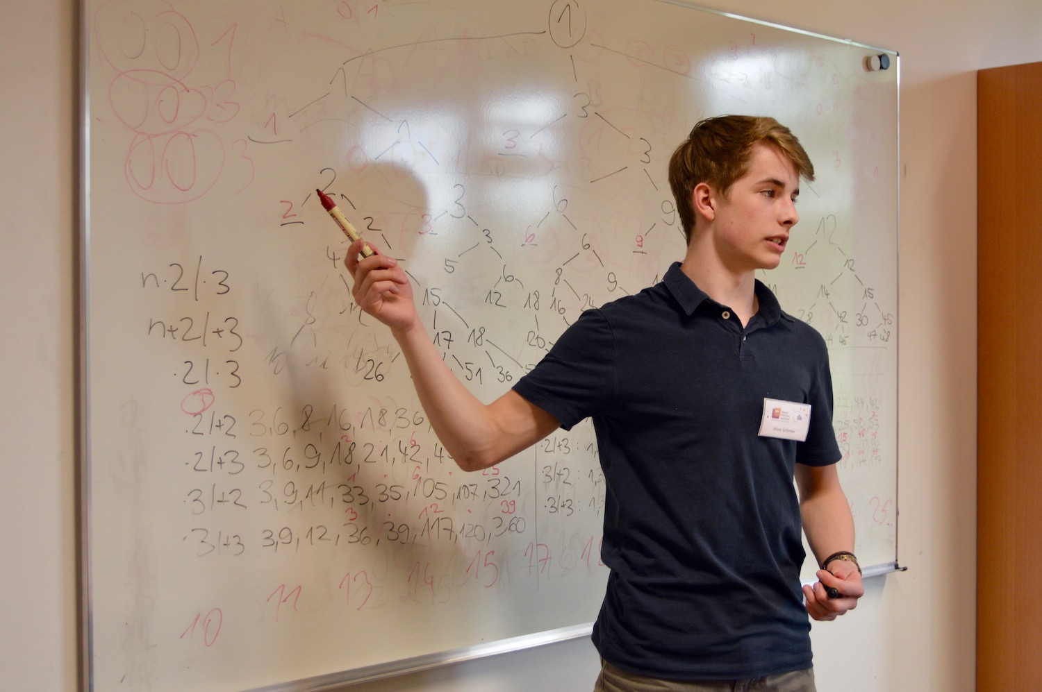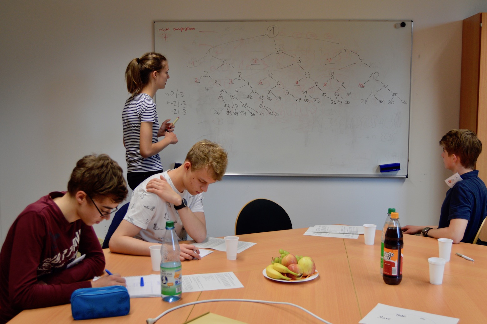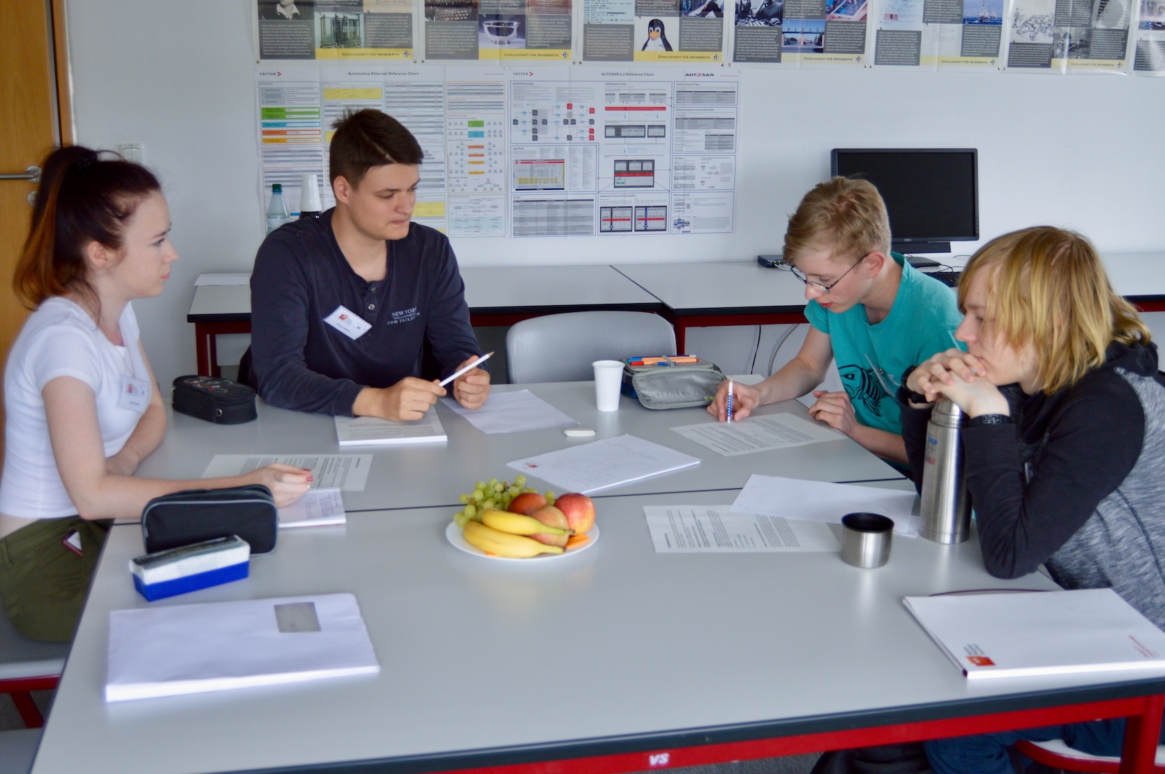 In der Gruppenarbeit bearbeiteten die Schülerinnen und Schüler in Teams von jeweils vier Personen vier Aufgaben, die anwendungsbreites Wissen verlangten und bei denen es darauf ankam, Informatikmethoden anzuwenden und effektiv im Team zusammenzuarbeiten. In diesem Jahr galt es u.a., ein Verfahren zu entwickeln, um anhand von Blutproben mit möglichst wenigen Tests alle kranken Personen einer beliebig großen Gruppe zu identifizieren oder alle möglichen Werte für Ausgaben eines nichtdeterministischen, also willkürlich agierendenden Programms zu ermitteln. In ihren Gruppen entwickelten die Schülerinnen und Schüler Strategien, um die gestellten Aufgaben zu lösen. Die Jurymitglieder beobachteten sie dabei und stellten fest, wer besonders mit Ideen und Leistung die eigene Gruppe voranbrachte. Die gestellten Aufgaben wurden von den Teilnehmerinnen und Teilnehmern interessiert aufgenommen und mit viel Elan wurden Lösungsstrategien entwickelt. Die Arbeitsergebnisse und Lösungswege wurden der Jury vorgestellt und mit den Juroren diskutiert. Schließlich präsentierten einzelne Gruppenmitglieder in einem kurzen Vortrag jeweils einen Teilaspekt des Gruppenergebnisses und stellten sich den kritischen Fragen der anderen Teilnehmerinnen und Teilnehmer sowie der Jury.