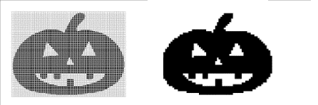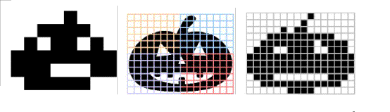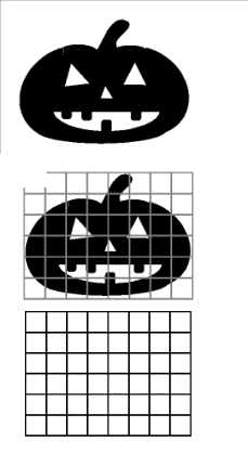 Die Schülerinnen und Schüler führen "per Hand" einen Scanvorgang eines Halloween Kürbises (Abb. 8 oben) auf dem Papier durch. Dazu wird über die Vorlage ein Raster gelegt (Abb. 8 Mitte). Die Schülerinenn und Schüler erhalten das Raster (Abb. 8 unten) und müssen nun für jedes Rasterelement entscheiden, ob dort der Wert schwarz oder weiß - Wertebereich des binären Zeichenvorrats - eingetragen werden muss. Entsprechend ihrer Entscheidung malen sie das Rasterelement (schwarz) aus oder lassen es leer (weiß).