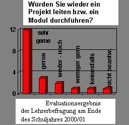 Die Zusammenarbeit zwischen Modul und Projektfächern hat noch einen weiteren entscheidenden Vorteil. Kolleginnen und Kollegen, die (noch) wenig Erfahrung in projektorientierem Unterricht, in der Arbeit mit neuen Medien haben, können hier trotzdem einen wichtigen Beitrag zum Gesamtkonzept leisten. Sie lernen bei der Begleitung einer Klasse selbst neue Arbeitstechniken und können dann zu einem späteren Zeitpunkt eine Projektleitung übernehmen.
