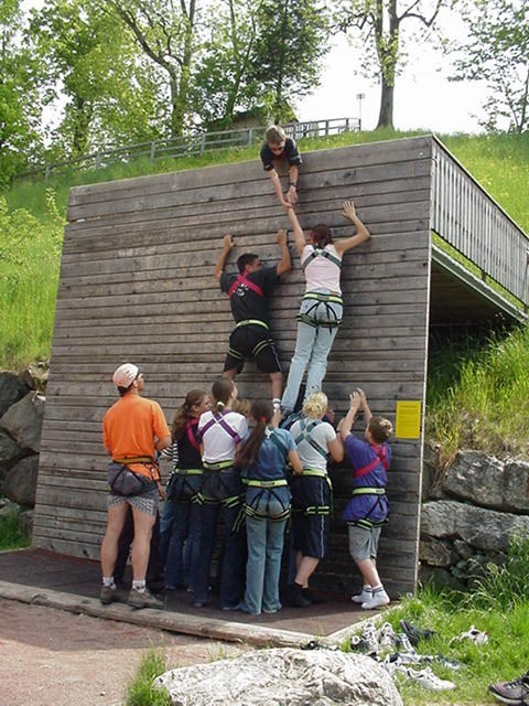 Zum Abschluss des Moduls kann noch ein Besuch in einem DAV-Ausbildungslager stattfinden. Die dort gestellten Aufgaben sind sehr anspruchsvoll, z.B. das Überwinden einer 4 m hohen Wand ohne Hilfsmittel (Abb. 12).