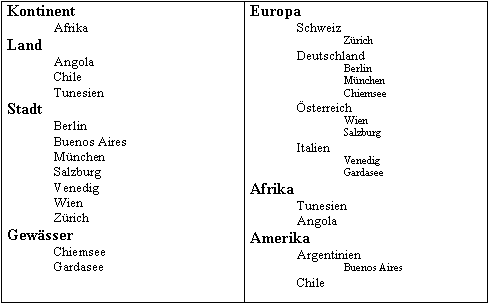 Sehr viele Strukturierungsmöglichkeiten sind aus der Sicht der Schülerinnen und Schüler sinnvoll, beispielsweise ob die Orte schon besucht wurden oder nicht, ob es sich um Wunschziele handelt oder nicht, usw. Folgende zwei Möglichkeiten werden herausgegriffen. Beiden liegt ein hierarchisches Datenmodell zu Grunde.