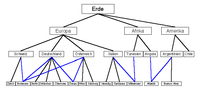 Nimmt man zur Bearbeitung von Teilaufgabe b) die "geographische Hierarchie" aus a) zu Grunde, reicht zur Lösung eine hierarchische Struktur nicht aus, da beispielsweise der Bodensee gleichzeitig den Ländern Deutschland, Österreich und Schweiz zugeordnet werden kann. Die notwendige Erweiterung ist ein Netzwerkdatenmodell.