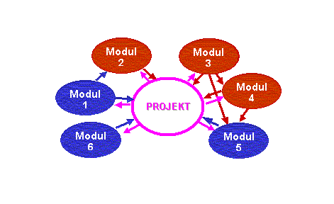 Jedes Modul thematisiert einzelne Arbeitstechniken und übt diese an Hand eines Unterrichtsthemas ein. Auf die so erworbenen Kompetenzen kann das Projektfach (selbstverständlich auch andere Fächer) zurückgreifen. Dieses Zusammenspiel zwischen Modulen und dem Projektfach ist in der Abb. 6 allgemein veranschaulicht.