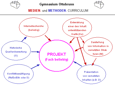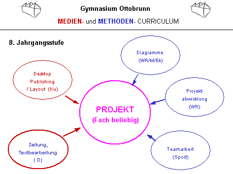 So findet in den Bereichen neue Medien und Methoden ein sukzessiver Aufbau von theoretischem und praktischem Basiswissen statt, welches in allen Klassen am Ende einer Jahrgangsstufe gleich ist und vor allem im arbeitsteiligen Projektunterricht angewendet werden kann. Durch die bereits vorhandene Medien- und Methodenkompetenz kann sich der Lehrer auf den Inhalte des Projektthemas konzentrieren statt Zeit für anwendungs- und ablauftechnische Fragen aufwenden zu müssen.