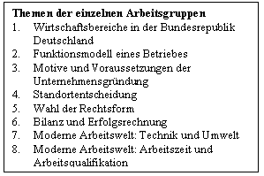 Während des Projektes war die Klasse in 8 Arbeitsgruppen unterteilt, die jeweils einen der oben aufgelisteten unterschiedlichen betriebswirtschaftlichen Aspekte untersuchten. In insgesamt 10 Unterrichtsstunden wurde zur Problematik hingeführt, Inhalte recherchiert, diese strukturiert und in Form von HTML vernetzt dargestellt. Bei der Projektarbeit diente als Arbeitsgrundlage die bereits in den Modulen aufgebauten Fähigkeiten im Bereich Quellenbewertung, Internetrecherche, Hypertexte, graphische Unterstützung von Inhalten und Präsentation vernetzter Inhalte.