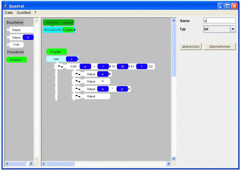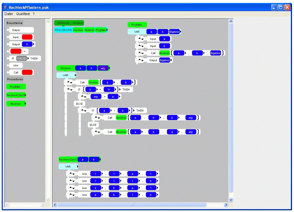 Der größte Nachteil visueller Programmiersprachen, komplexe Inhalte vergleichsweise unübersichtlich darzustellen, tritt bei von Anfängern konstruierten Programmen nicht auf, da diese nur einen geringen Umfang haben3. In einer vom Autor an der Friedrich-Schiller-Universität Jena verfassten Diplomarbeit wurde nach einer vorherigen Erhebung von Anforderungen eine visuelle Programmiersprache mit einem zugehörigen Programmiersystem für den Einsatz in Schulen entwickelt. Mit Hilfe dieses Systems können Anfänger ein Programm per Drag and Drop konstruieren. Im Verlauf des Lernprozesses werden den Schülerinnen und Schülern - je nach Konfiguration durch den Lehrer - nur bestimmte Bausteine zur Verfügung gestellt. Dadurch bekommt ein Anfänger die Möglichkeit, das Programmieren schrittweise, also Anweisung für Anweisung, zu erlernen. Die visuell erstellten Programme können stets direkt ausgeführt werden.