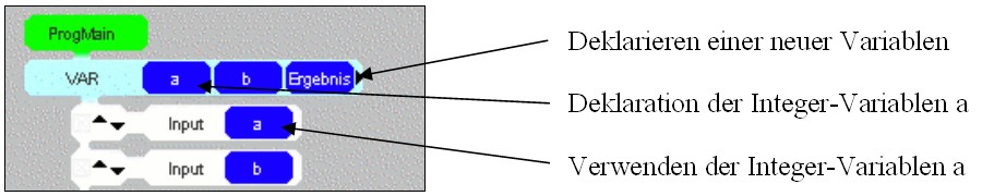 Variablen werden deklariert, indem das kleine schwarze Dreieck rechts neben dem Schlüsselwort VAR angeklickt wird. Sie werden fortlaufend mit kleinen Buchstaben des Alphabetes benannt. Name und Datentyp können in der Attributtabelle, die sich beim Anklicken der Bausteine jeweils auf der rechten Seite des Bildschirms befindet, verändert werden. Es wird nach jeder Veränderung überprüft, ob ein Variablenname im gegebenen Kontext bereits vergeben wurde bzw. ob er den Namenskonventionen entspricht. Variablen vom Typ Integer sind dunkelblau, Variablen vom Typ Boolean sind grau dargestellt.