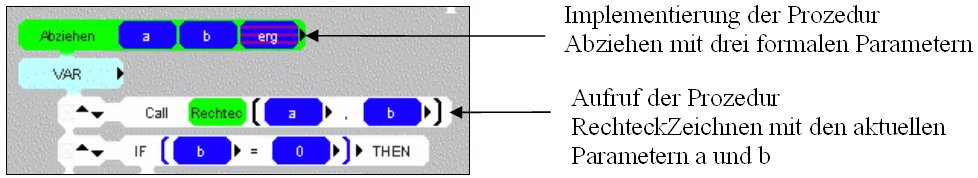 Bei einem Prozeduraufruf müssen die aktuellen mit den formalen Parametern in Anzahl, Typ und Reihenfolge übereinstimmen. Um dies zu garantieren, wurde im Puck-System durchgängig mit dem Observer-Entwurfsmuster (vgl. [Ga97]) gearbeitet. Wenn der Benutzer die Signatur einer Prozedur verändert, indem er zum Beispiel einen weiteren Wertparameter vom Typ Integer hinzunimmt, so wird vom System in jeder Anweisung, in der diese Prozedur aufgerufen wird, ein Integer-Ausdruck eingefügt, der der Prozedur als aktueller Parameter übergeben wird. Auch das Verändern des Namens einer Prozedur oder einer Variablen wirkt sich nicht nur auf die Deklaration, sondern auch auf jede Verwendung derselben im gesamten Programm aus. Referenzparameter werden in Puck durch eine Schraffierung gekennzeichnet.