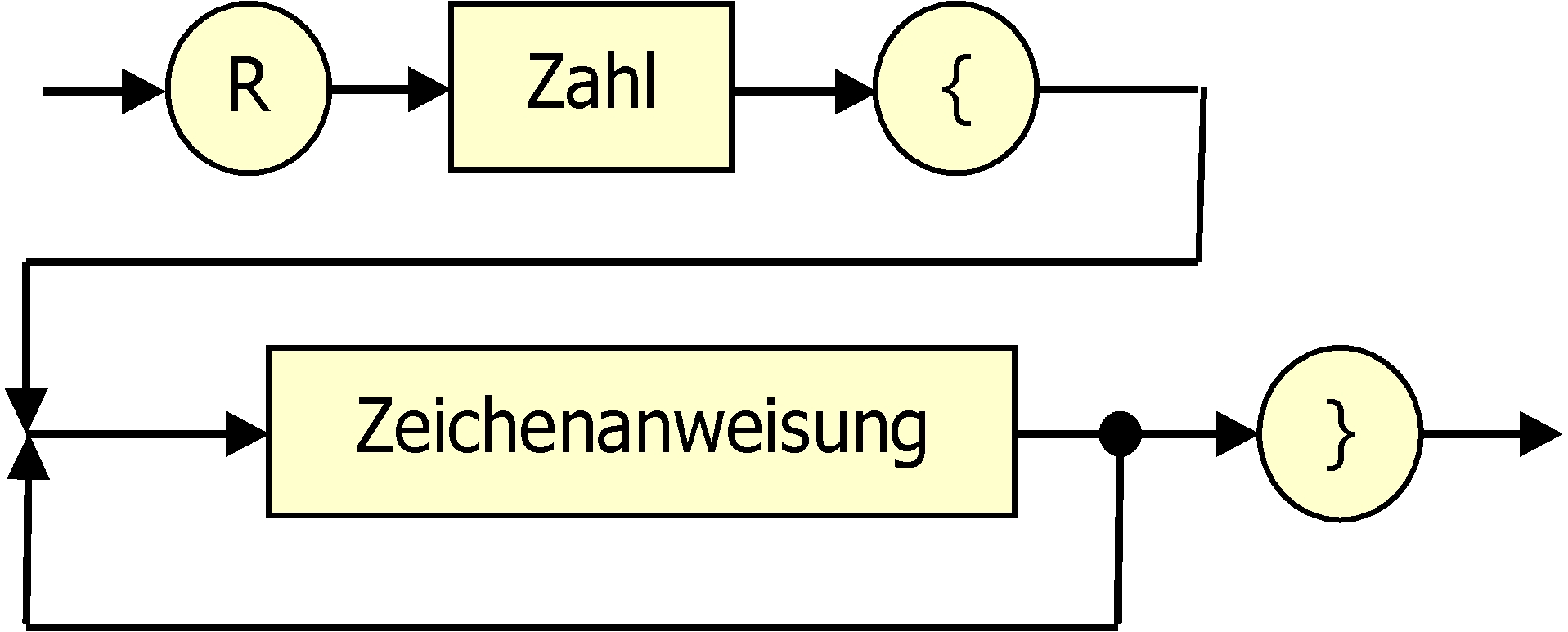 Die Syntax ist etwas an Java angelehnt (mit den geschweiften Klammern). Es können nur Zeichenanweisungen mehrfach wiederholt werden. |