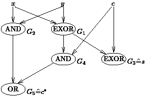 A circuit is a directed acyclic graph with inputs (no incoming edges) representing boolean variables and constants, and gates (one or two incoming edges and a gate type like NOT for a gate with one incoming edge and AND, OR, or EXOR for two incoming edges). The gates are numbered sequentially, i.e., an edge leading from Gi to Gj implies i<j. Some gates are declared as output gates. The sequential computation is a gate-by-gate computation. For an actual input the inputs of a circuit all realize boolean values. If we know the values realized at G1,..., Gi-1, we know the input values of Gi and can apply the boolean operation corresponding to Gi to these values in order to obtain the value realized at Gi. The example in Figure 1 implements a full adder for the bits x and y and the carry c. The outputs are the sum bit s and the new carry c*.