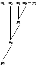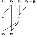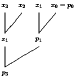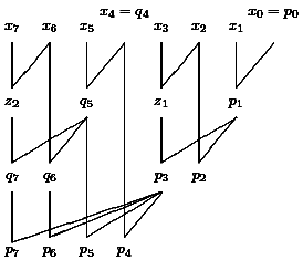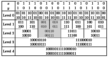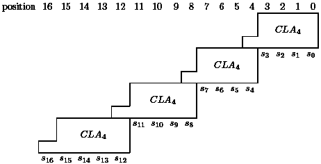 The first line of each level contains the results for the value 0 of the carry bit and the second line contains the result for a carry bit equal to 1. We consider the part of the computation which is marked in Figure 15. We have to compute (0,1,0,0)+(0,0,1,0)+c for c=0 and c=1. The last two bits are known, since we have computed (0,0)+(1,0)+c on the last level. Hence, we are interested in the leading three bits. We also know the results for (0,1)+(0,0)+c', c'=0 and c'=1, from the last level. Here c' is the carry from the previous block and c' depends on c. Since the leading bits of the results 010 and 011 (last level, previous block) are 0, we have in both cases c' = 0 and get in both cases the result of (1,0)+(0,0)+0. This iterative tableau also simplifies the analysis. Level 0 has depth 1 and each other level has depth 2 (the two lines of each block can be computed in parallel).