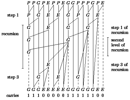 Now it is easy to see that the carries at the position 15, 14, and 13 are generated at position 13 and then propagated. The G-position 7 generates a carry at position 7 which is eliminated at position 8, the G-position 6 generates a carry for this position. Finally, the G-position 2 generates a carry at position 2 which is propagated to the positions 3, 4, and 5. This example directly leads to an algorithmic idea: