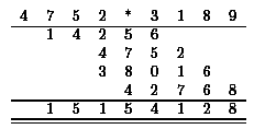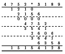 - compute p2 = | x'| . | y'| by recursion, - compute s1 = p1 + p2, - compute s2 = | x"| + | x'|, - compute s3 = | y"| + | y'|, - compute p3 = p1 . p2 by recursion, - compute the result as p3 - s1 (the subtraction is easy, since it is known that the result is not negative). |