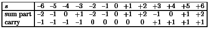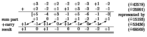 The surprising and crucial decision is to represent +3 as (-1).40+(+1).41 and not in the more natural way (+3).40+(0).41. The representation of -3 is chosen in the analogous way. The effect of this choice is that all sum parts are contained in {-2, -1, 0, +1, +2} and all carries are contained in {-1, 0, +1}. Hence, in the next step we have to add a sum part and a carry leading to a value in { -3, -2, -1, 0, +1, +2, +3} implying that the sum can be represented without carry. Figure 17 shows an example.