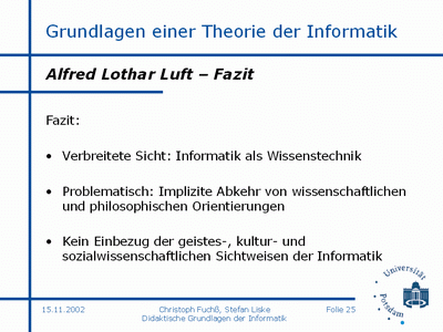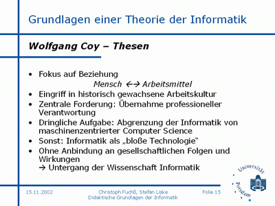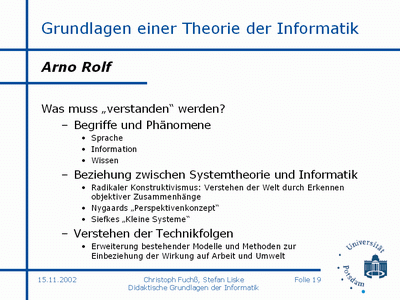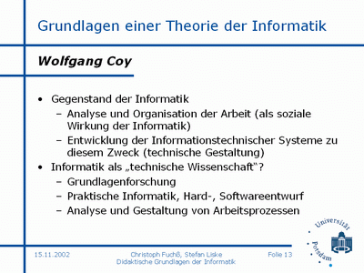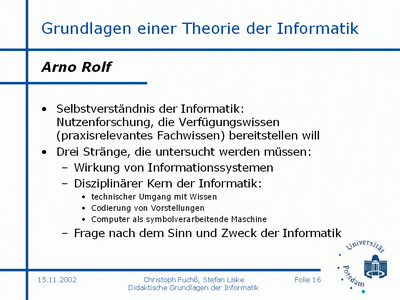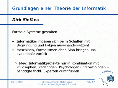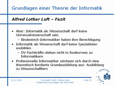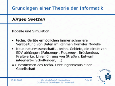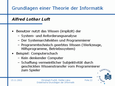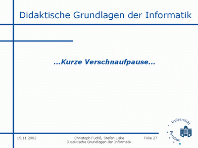 - Der Lehrstuhl Didaktik der Informatik der Uni Potsdam bearbeitet in Forschung, Lehre, Entwicklung und Service Fragestellungen zur Didaktik der Informatik, zur Gestaltung des Lehramtsstudiums Informatik, sowie zur Lehrerfortbildung und Lehrerweiterbildung