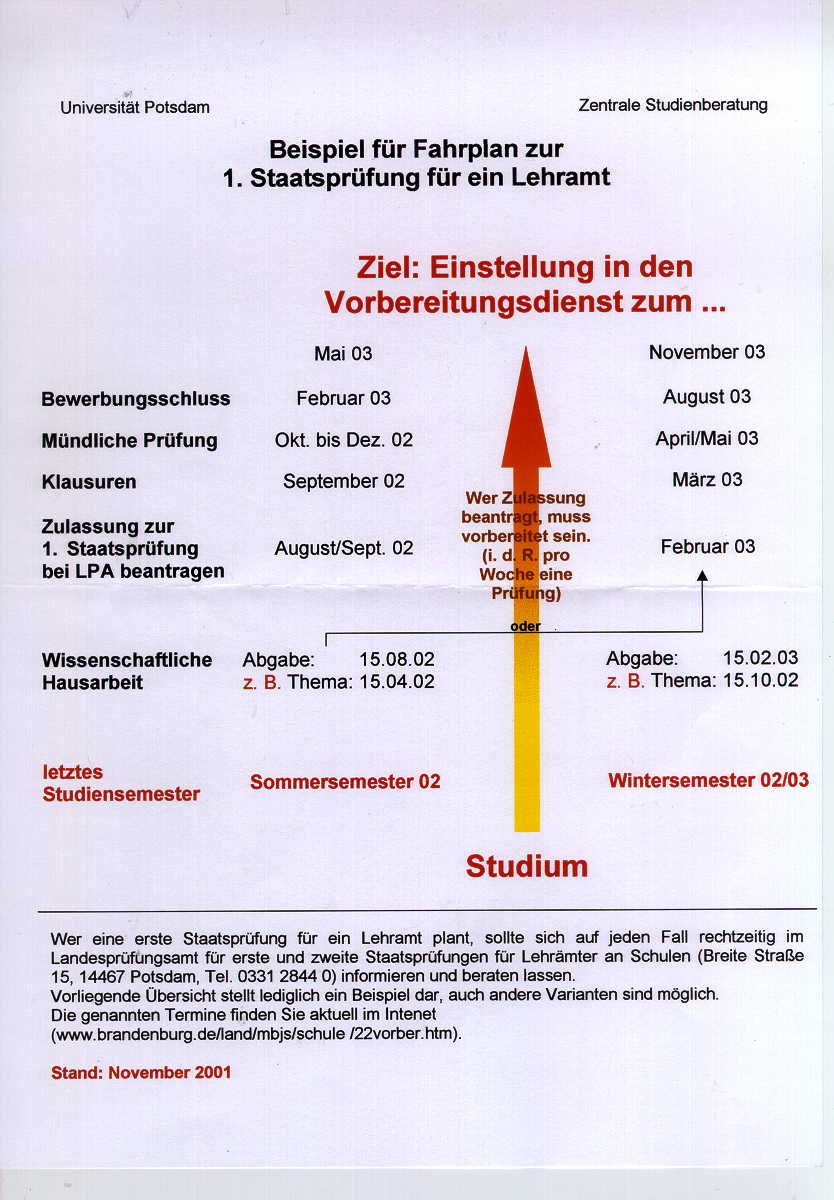 Beispiel für einen Fahrplan zur 1. Staatsprüfung für ein Lehramt - Zentrales Prüfungsamt Uni Potsdam - 2002