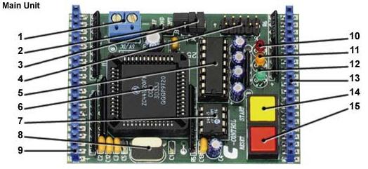 Die auf der nächsten Seite beschriebene Main-Unit (auch als Steuercomputer bezeichnet) verkörpert das eigentliche Microcontrollersystem. Es vereint mit der CPU, dem Daten- und Programmspeicher sowie den passenden Anschlüssen für die Ein- und Ausgabe alle oben genannten Komponenten eines von Neumann- Computers.