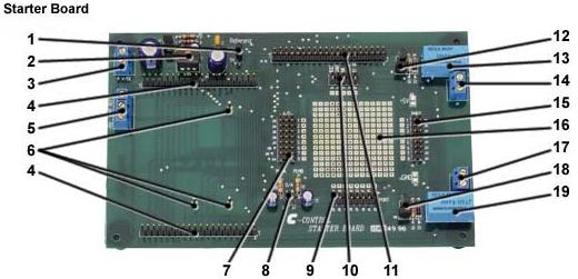 Das nachfolgend beschriebene Starterboard ermöglicht einen unkomplizierten Zugang zu den Anschlüssen der im vorigen Abschnitt beschriebenen Main-Unit. Alle Signalleitungen sind übersichtlich so herausgeführt, daß verschiedenste Sensoren und Verbraucher sowohl  elektrisch als auch mechanisch auf leichte Art angeschlossen werden können. Beispiele für derartige Sensoren sind im Abschnitt 2.7. beschrieben.