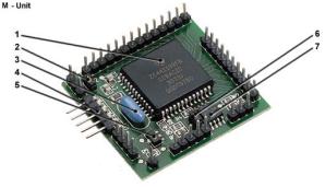 Die M-Unit ("Mini-Unit") ist eine vollwertige C-Control-Unit, die speziell für räumlich kleine Anwendungen entwickelt wurde. Wäh-rend der Prozessor derselbe ist wie auf der Main-Unit, fehlen aus Gründen der Platzer-sparnis jedoch LEDs, Taster, Schnittstellen-IC sowie die Pull-Up-Widerstände. Zusätzlich zur Ausstattung einer Main-Unit bietet die M-Unit dagegen drei Schnittstellen mehr: