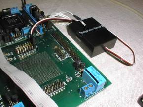 Dazu wird ein von conrad-electronic angebotener fertig kalibrierter Temperatursensor an den AD-Port 1 des Starterboards angeschlossen. Die Verwendung des Starterboards hat den Vorteil, daß dieser Sensor über den dreipoligen Anschluß mit der notwendigen Versorgungsspannung von 6,5V versorgt werden kann.