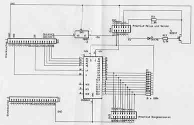Da die C-Control-Unit nur 8AD-Porteingänge besitzt, können die 10 Sensoren nicht direkt angeschlossen werden. Wir haben uns daher entschlossen, einen 16Bit-Analog-Digital-Multi-plexer einzusetzen. Dieser ist in der Mitte der Schaltung zu sehen.