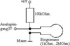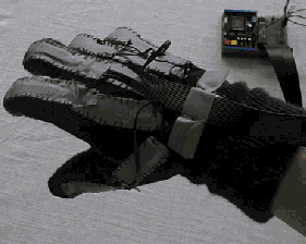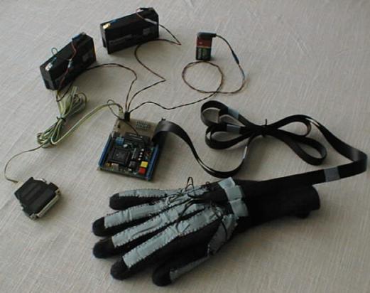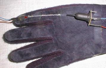 Dieser arbeitet ähnlich wie ein Folienschalter, ändert aber, im Gegensatz zu konventionellen Schaltern, den Widerstand bei in Normal-Richtung aufgebrachtem Druck. Ein Fingerdruck von 10g bis 10kg auf einen Sensor bewirkt, daß der Widerstand von ca. 2MW auf ca.>1kW abfällt. Wir haben uns entschlossen, zunächst 10 dieser Sensoren am Handschuh zu befestigen, und zwar auf den mittleren Fingerknöcheln sowie an den Gelenken zwischen Handballen und Finger.