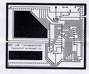 Das zugehörige Layout wurde wie die in 4.2.2. beschriebene Schaltung mit Hilfe des Programmes Eagle entworfen und entsprechend geätzt. Eagle ist in einer Sharewareversion erhältlich und liegt im Verzeichnis "\Eagle" zur Installation bei. Um sich die Schaltbilddatei und das zugehörige Layout (Verzeichnis "Eagle\Datenhandschuh") mit Eagle ansehen zu können, muß die selbst erstellte Bibliotheksergänzung "harris.lbr" in das Eagle- Bibliotheksverzeichnis kopiert werden. Sie enthält den standardmäßig in Eagle nicht verfügbaren Multiplexerbaustein.