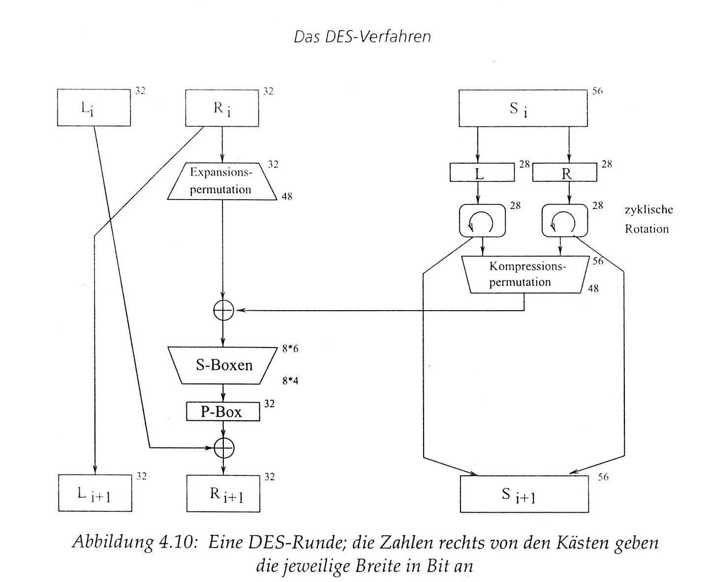 Die 32 Bit Folge wird permutiert, d.h. Ihre Reihenfolge geändert. Diese Transformation wird durch die P-Box beschrieben. (Die P-Box ist einfach eine bestimmte Anordnung der Zahlen von 1 bis 32) Der entstandene 32 Bit Block wird per XOR mit der linken Blockhälfte Li verknüpft. Dadurch