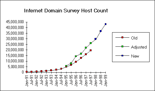 Das Internet ist zweifellos eines der interessantesten und am schnellsten wachsenden Medien unserer Zeit wie die folgende Abbildung verdeutlicht. Sie zeigt die Anzahl der Rechnerknoten von Januar ‘91 bis Januar ‘99. (Quelle: Network Wizards)