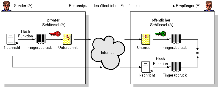 Um die Integrität der übermittelten Daten zu gewährleisten, d.h. um sicherzustellen das Sender und Empfänger über die gleichen Daten verfügen und diese nicht etwa während des Transfers modifiziert wurden, wird z.B. das Verfahren der digitalen Signatur angewandt. Dabei wird mittels einer speziellen Einweg-Hash-Funktion der sogenannte digitale Fingerabdruck (Message Digest) einer Nachricht ermittelt, welcher dabei folgende Eigenschaften aufweist: