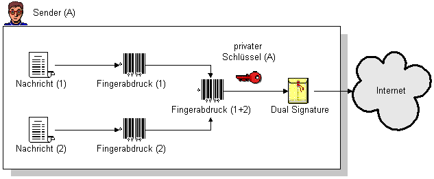 Eine Erweiterung der digitalen Signatur ist die Dual Signature. Dieses Verfahren, welches insbesondere beim SET Standard eingesetzt wird, gestattet es zwei getrennte Nachrichten durch eine elektronische Unterschrift miteinander zu verbinden. Der Sender erzeugt dabei zu jeder Nachricht eine digitale Signatur, verknüpft diese miteinander und verschlüsselt das Ergebnis mit seinem privaten Schlüssel.