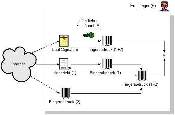 Der Empfänger der Nachricht bildet aus dieser seine eigene digitale Signature, verknüpft diese mit der mitgesendeten digitalen Signatur der zweiten Nachricht und vergleicht das Ergebnis mit der entschlüsselten Dual Signature.