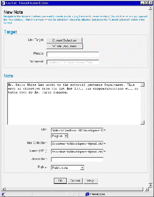 is possible to attach a note to any object in Hyperwave Information Server. By