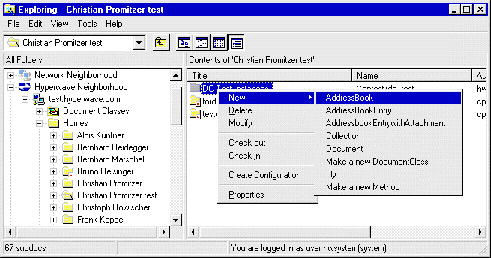 The main item that appears on the pop-up menu is the item New. Under New, all possible insertables for Document Classes will be listed. In other words, when you right-click on a document on the server where the document class AddressBookEntry has been declared, the choices under New will include AddressBookEntry. See Figure 77.