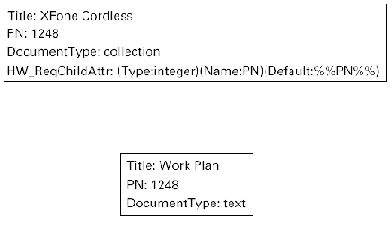 This feature is useful in any case where an attribute should be propagated down through an entire collection hierarchy. For example, you might have a collection containing all information related to a certain project. Each project in your company has a project number to identify it. You want to give all documents and collections that are contained in a project collection the same project number automatically. An example of how this could be done using required attributes is shown in Figure 94. The collection with the title "XFone Cordless" has the project number (PN) 1248. The HW_ReqChildAttr attribute specifies that all children documents of the collection have the same project number as the parent collection. As can be seen in the figure, the text document that is contained in the collection has the same project number as the collection. The syntax when using HW_ReqChildAttr is explained in the course of this text.