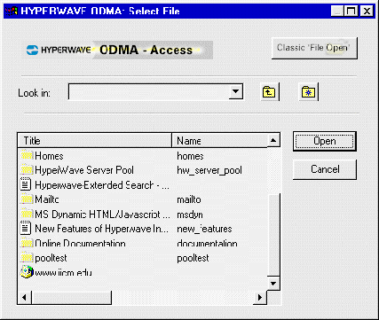 - Select File->Open. The Hyperwave ODMA Select File dialog