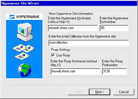 Click on the Add new server icon to start the Hyperwave Site Wizard in